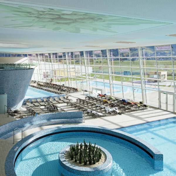 In der Salzkammergut-Therme ist - wie in der Region - das Thema „Salz und Sole“ bestimmend. Sowohl beim Entspannen in den verschiedenen Sole-Becken und Grotten als auch in den verschiedenen Genuss-Zonen der einzigartigen Saunawelt. -