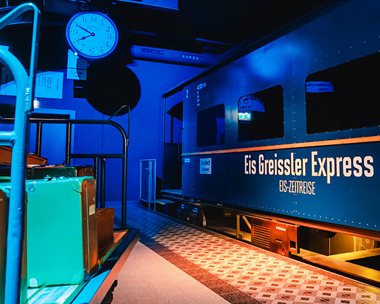 Die Eis-Zeitreise ist die neue Führung beim Eis-Greissler in Krumbach. Erlebe hier ein einzigartiges Erlebnis in 3 Stationen: Mache im Eis-Greissler Express eine Zeitreise in die Vergangenheit und fühle dich Jahrtausende zurückversetzt in die Krumbacher Eiszeit, fliege im spektakulären Flying Theater virtuell durch unsere Eis-Produktion und genieße die neuesten Eissorten in unserem Versuchslabor. Als Schaffner begrüßt dich kein geringerer als Rudi Roubinek und nimmt dich mit auf eine aufregende Fahrt durch die Eis-Geschichte.