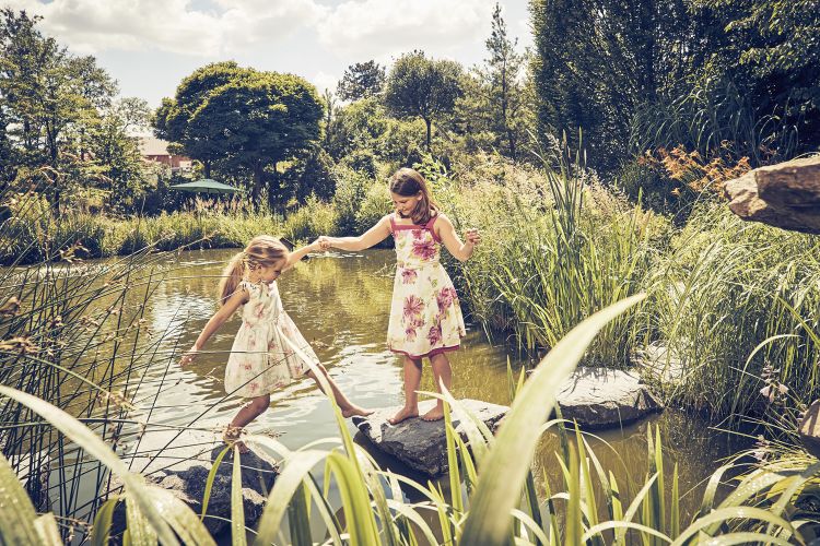 Im Wunderland der Gartenfantasie grenzt Asien an Weinberge, portugiesische Feuerkunst trifft auf keltische Kraft, vom Regenbogen geht’s munter weiter in die Steppe, von der Riesenrutsche aufs Floß. Kräuter winden sich spiralförmig an einem Hügel empor und zeigen sich an zwei Wegen, die sich einander nie begegnen. Figuren und Skulpturen überraschen. Alpakas, Ponys und Ziegen grüßen. Bänke und Liegen, bequem mit Kissen bestückt, laden zum Verweilen und Schauen ein. Stets präsent sorgen Erlebnisgärtner Reinhard Kittenberger und sein Team für frische Impulse, gekonnt dezent fürs Wohlergehen von Pflanzen, Tieren und Besuchern.